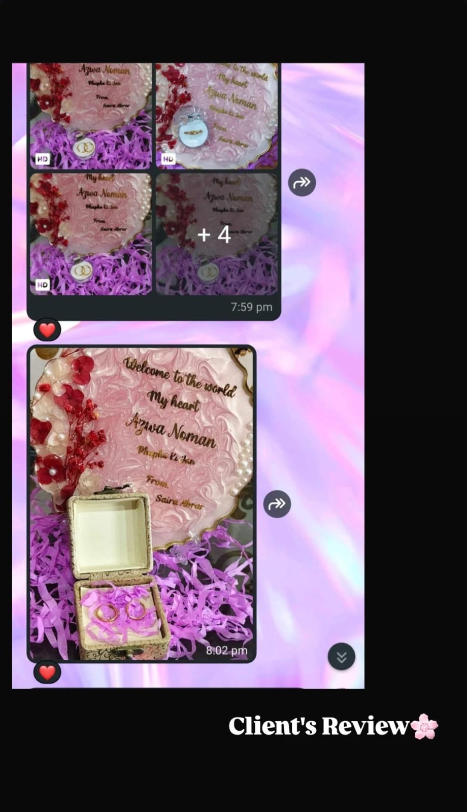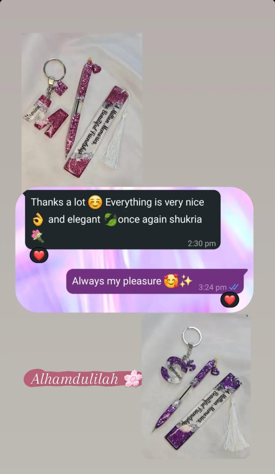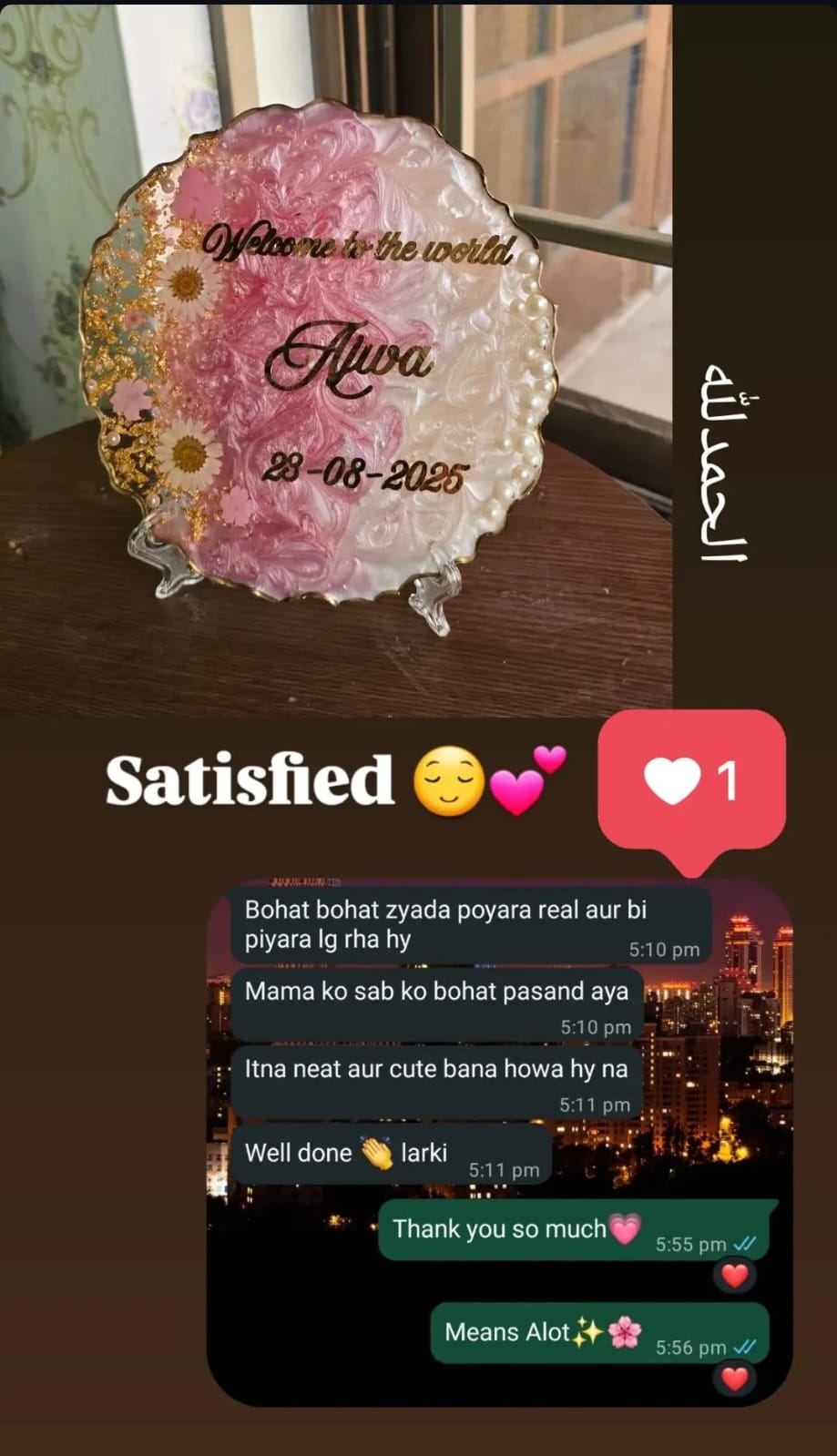 We specialize in crafting custom-made resin treasures — from elegant frames that preserve your cherished memories to personalized pendants and rings, nikkah trays, Islamic stands, car hanging charms, and more. Every piece is meticulously crafted with high‑quality materials and attention to detail, making it a perfect keepsake or heartfelt gift. Our mission is to bring your vision to life through expert craftsmanship and seamless customization, ensuring each item holds special meaning.